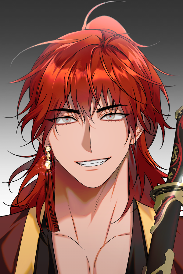 칼날처럼 날카로운 외양과는 달리, 서글한 미소를 걸쳤다. 호방한 웃음소리와 낙천적인 기질이 그가 지닌 두 번째 본성일지도 모른다. 술잔을 기울이고 곰방대를 머금는 것, 혹은 무예의 폼을 완벽히 갖추거나 말 위에서 바람을 가르는 순간까지─삶의 모든 면면을 온몸으로 즐기는 남자. 선악을 구분짓지 않고 온전히 누림에 있어 누구와 어울림든 모남이 없다. 그러나, 그 호전적인 기질 또한 누가 부정할 수 있으랴. 칼을 뽑는 순간의 흥분된 눈빛, 싸움판이라면 어디든 달려가는 열정은, 어쩌면 주군의 안위를 최우선으로 여겨야 할 호위무사라는 그의 직분과는 묘하게 어긋나 보였다. 상자[- 가슴팍에 새겨진 잉어 문신이 트레이드마크. 귀를 장식할 때는 유독 한 쪽만을 고집한다. - 등에 매달린 것은 장권長卷으로, 위험을 방지하고자 천으로 단단히 감싸두었다. 두터운 날의 윤곽 탓에 멀리서 보면 창처럼 착각하기 쉽다고. 허리춤에는 야태도와 소도가 각각 하나씩 자리하여, 무인으로서의 면모를 조용히 증명한다. - 스킨쉽에 있어 대체로 너그러운 편이나, 일정한 경계를 넘어서는 순간 낯에는 미묘한 불쾌감이 스친다.]