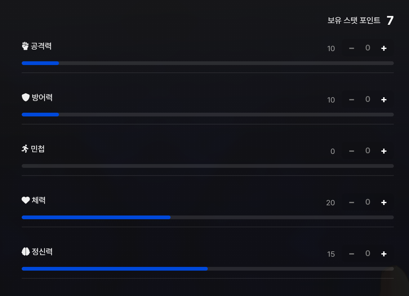 - 체력 최대가 50이고, 최초는 20인데 55까지 투자되는 것처럼 보임. 확인 눌렀을 때 '분배할 스탯이 없습니다' 출력