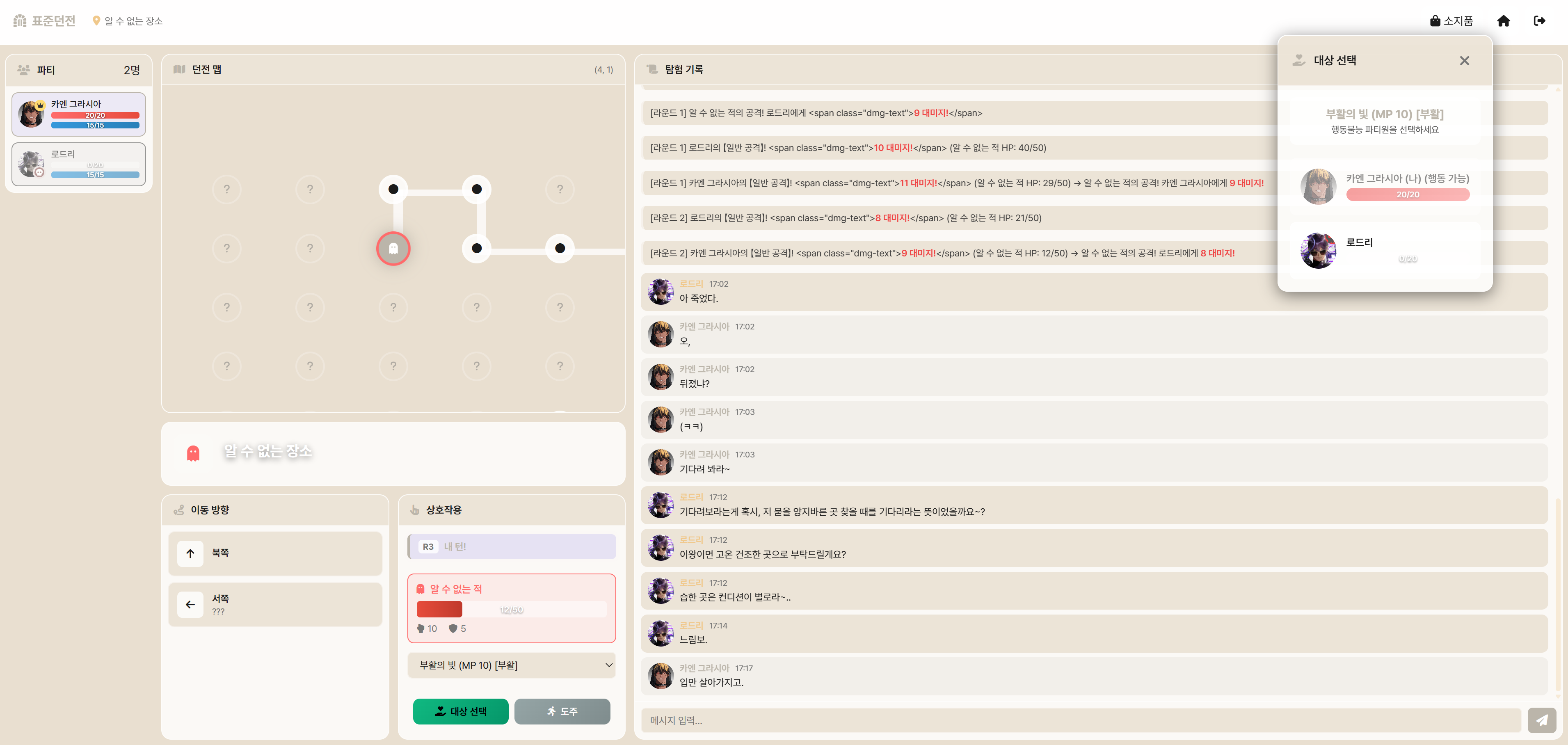 3. 파티원끼리 결정되는 만큼, 턴을 확실히 해야 함. 민첩 순서대로 턴을 배분할 것. 파티원 10 > 몬스터 9 > 파티원 8 이런 식으로. 파티원이 9, 몬스터가 9일 경우 랜덤으로.